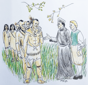 Don Luis introduced the Fathers and Alonzo to the Native Americans including Powhatan’s father. The Fathers soon learned that there was a shortage of food as there had been little rain for many moons. With the help of Don Luis, the Fathers introduced Christianity to the Native Americans.